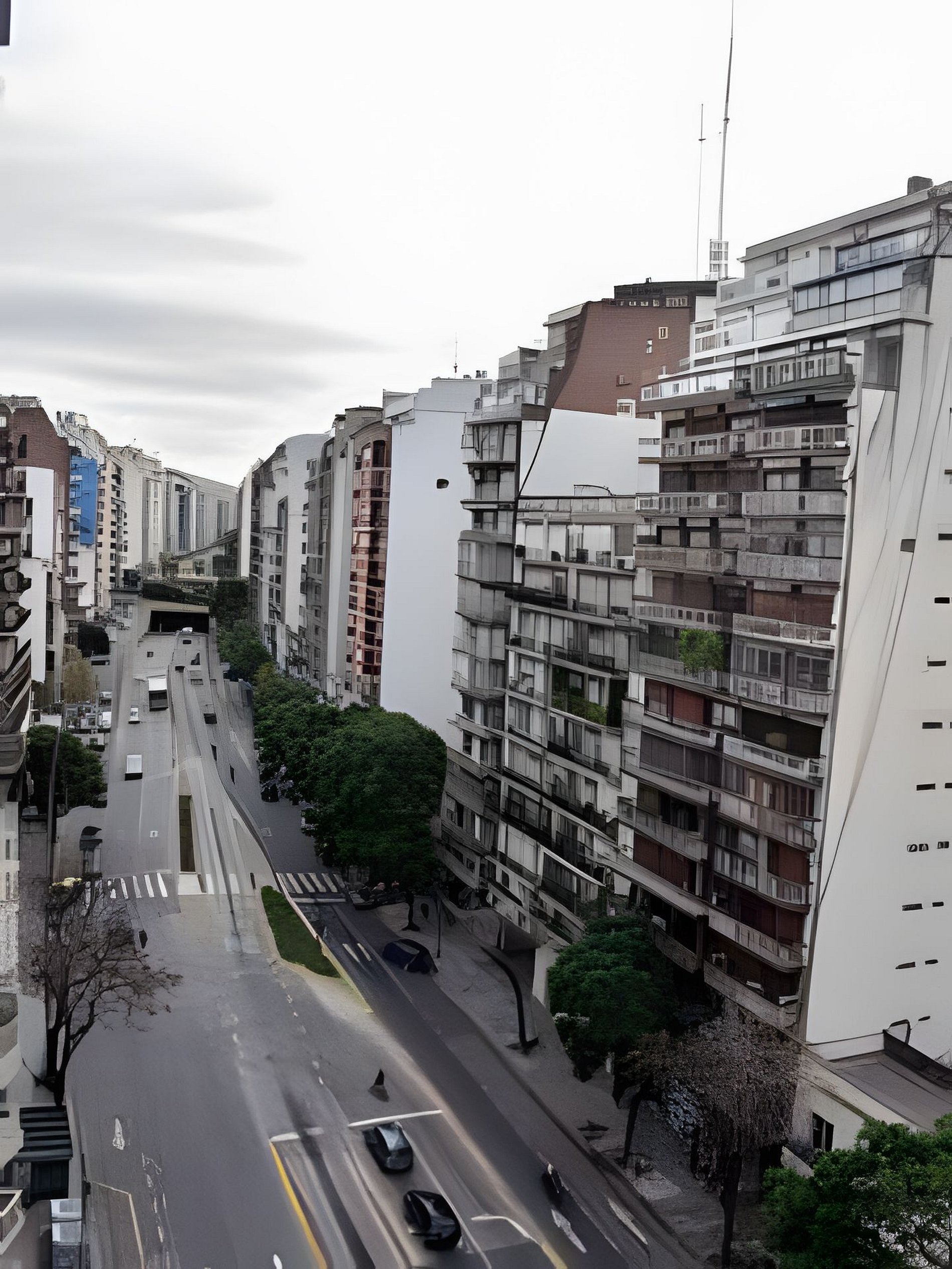 El edificio ubicado en Palermo en Av Santa Fe entre Bonpland y Carranza. Presenta una estética moderna y minimalista, con una fachada limpia dominada por el color blanco y tonos claros de hormigón alisado. Se trata de una torre de doce pisos más un nivel superior (piso 13) que actúa como remate arquitectónico, donde habitualmente se ubica la piscina o área común, visible por su baranda superior corrida.