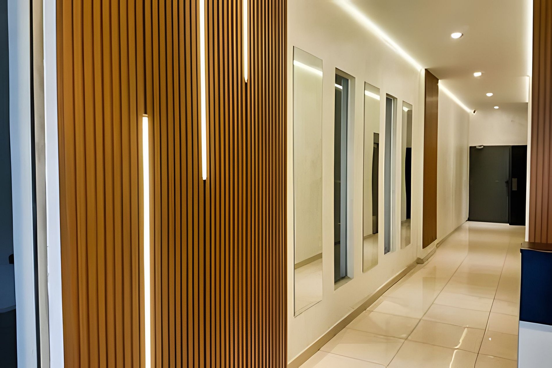La fachada se organiza de manera simétrica, con amplios balcones corridos en cada planta, delimitados por barandas metálicas horizontales pintadas en blanco que aportan liviandad visual. El diseño prioriza la horizontalidad y la uniformidad, con ventanales de piso a techo que maximizan la luz natural y otorgan una imagen contemporánea y funcional.