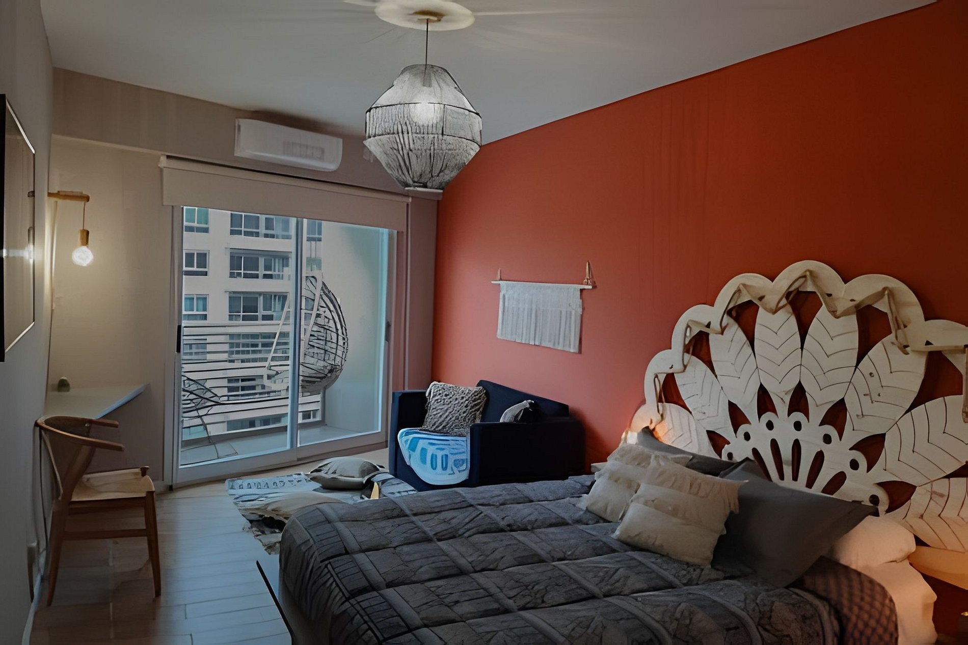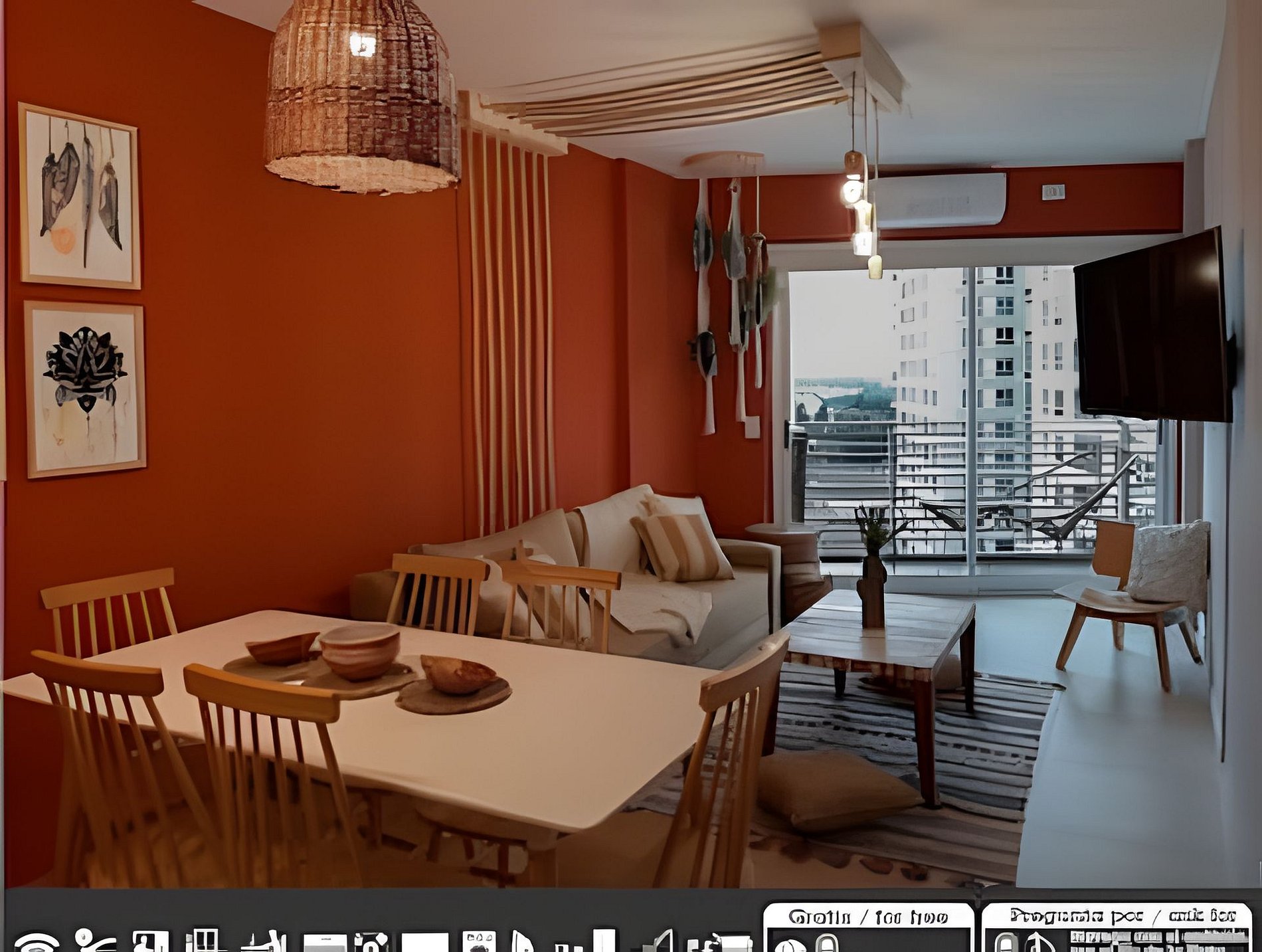 Hermoso departamento de 80 m² en un edificio nuevo, con balcón en piso 12 y vista al Río de la Plata. Su interior boho–natural combina tonos terracota, fibras vegetales y detalles artesanales que crean un ambiente cálido y relajante. Cuenta con dos habitaciones, baño completo y toilette, amplio living comedor y cocina equipada. Incluye cochera, WiFi, aire acondicionado y piscina con vista panorámica en la terraza.