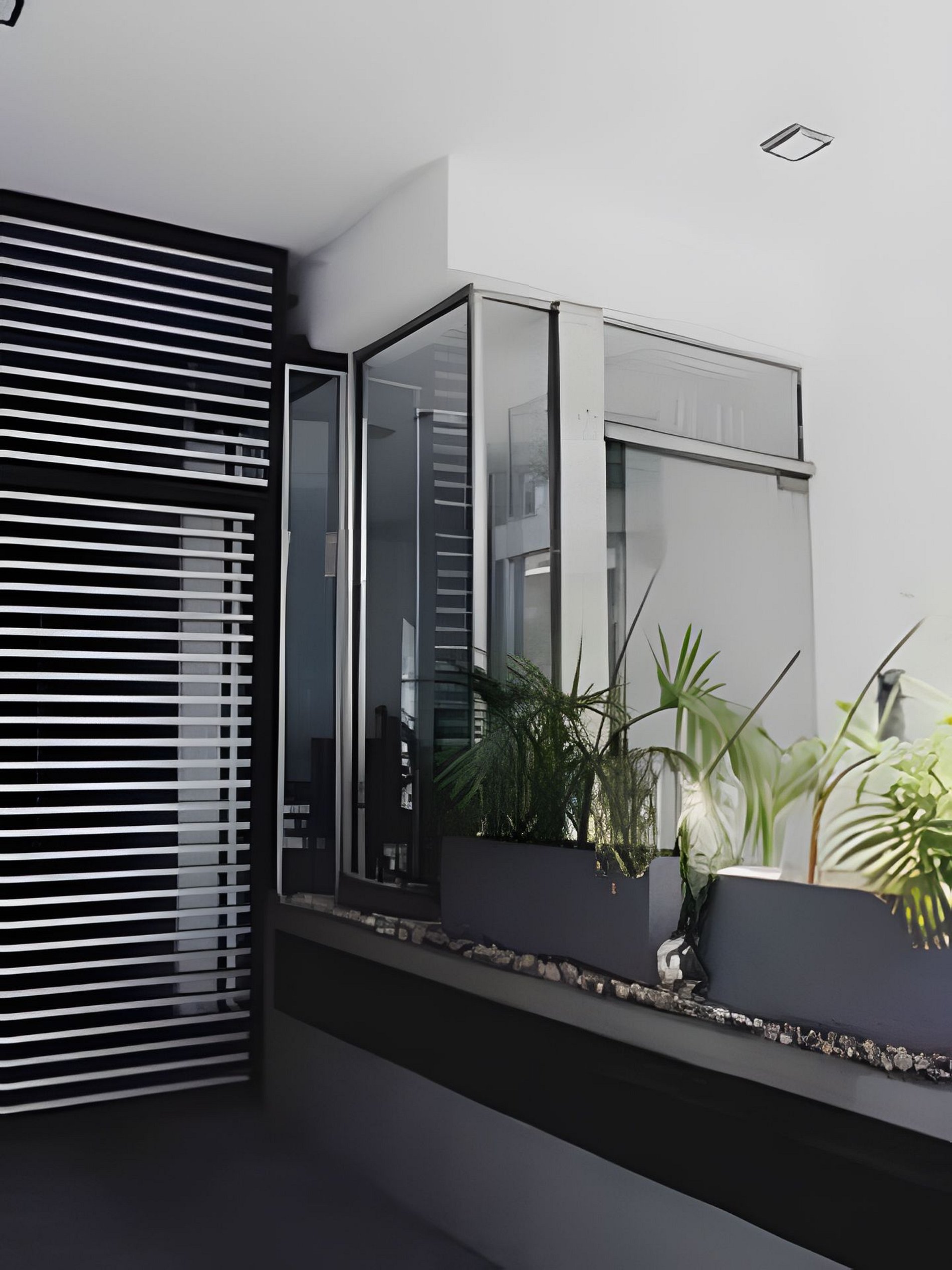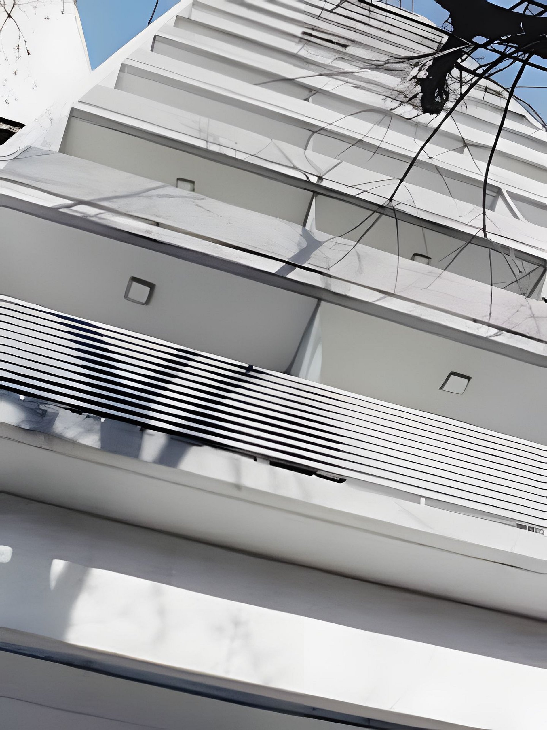 La fachada se organiza de manera simétrica, con amplios balcones corridos en cada planta, delimitados por barandas metálicas horizontales pintadas en blanco que aportan liviandad visual. El diseño prioriza la horizontalidad y la uniformidad, con ventanales de piso a techo que maximizan la luz natural y otorgan una imagen contemporánea y funcional.
