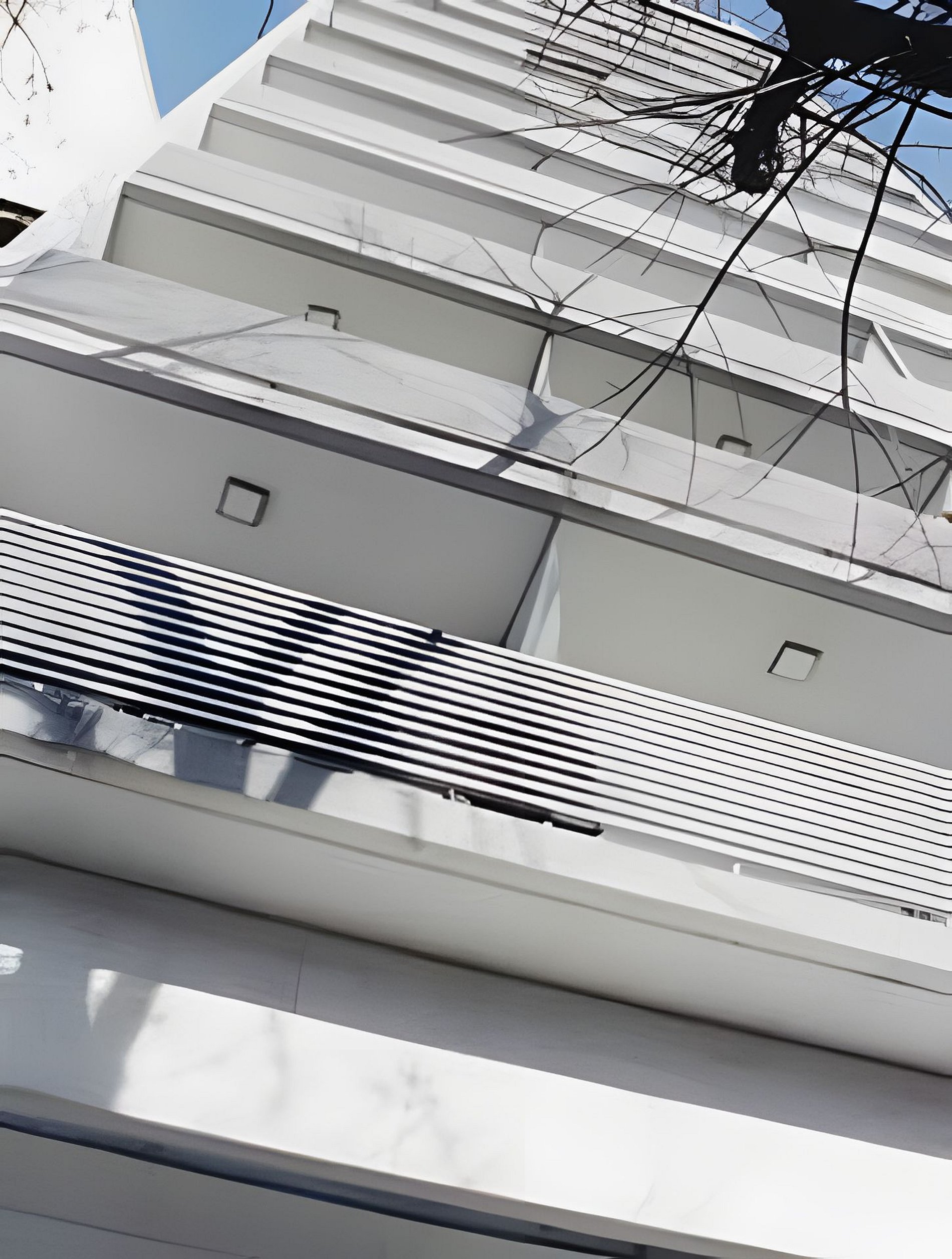 La fachada se organiza de manera simétrica, con amplios balcones corridos en cada planta, delimitados por barandas metálicas horizontales pintadas en blanco que aportan liviandad visual. El diseño prioriza la horizontalidad y la uniformidad, con ventanales de piso a techo que maximizan la luz natural y otorgan una imagen contemporánea y funcional.