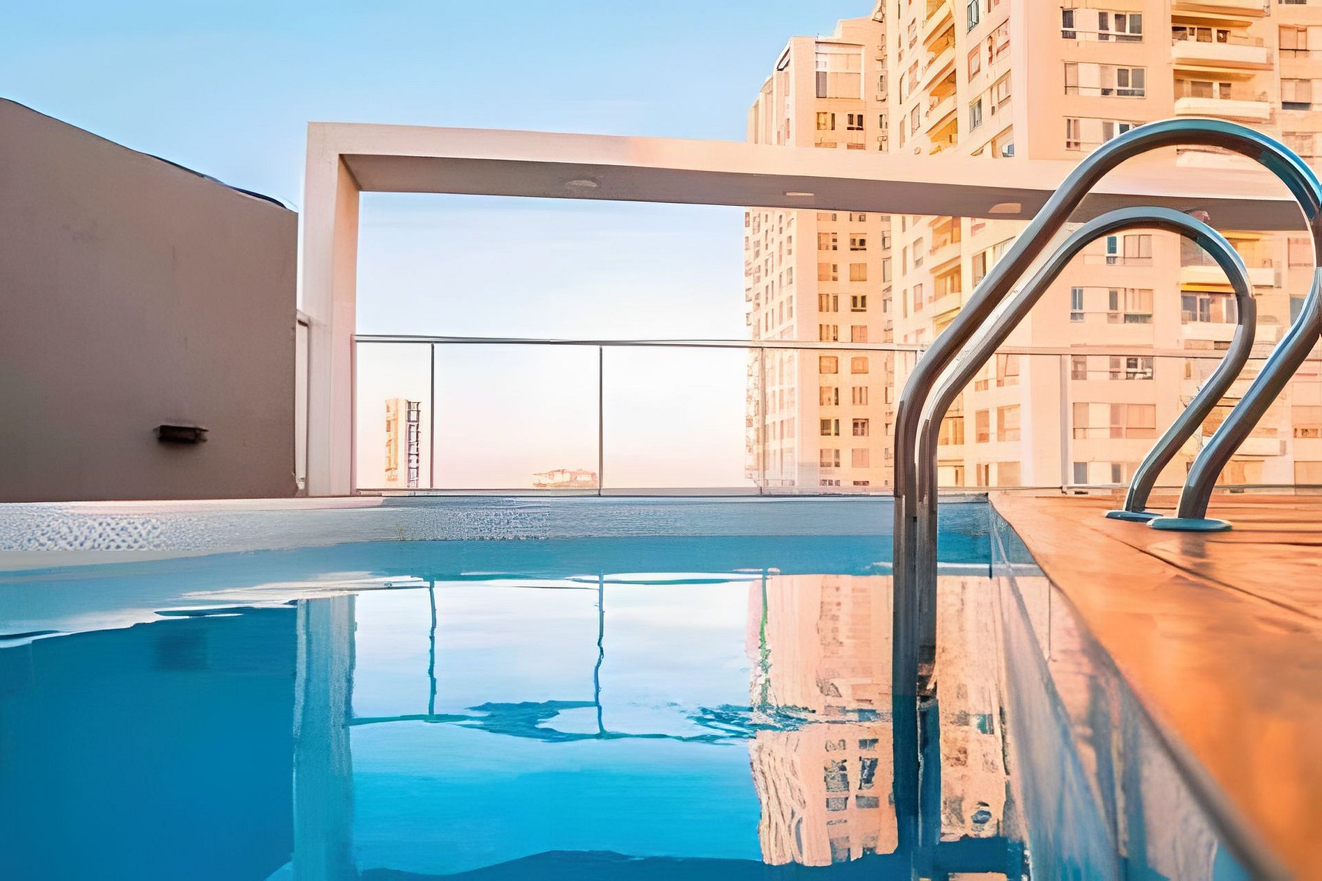 El edificio cuenta con una amplia piscina en la terraza, solarium. Espacio de guardado para late-checkout. Cocheras. Conexión WIFI gratuita. Vigilancia a través de cámaras de seguridad. 2 ascensores principales. Supermercado Carrefour a 10 metros del edificio.