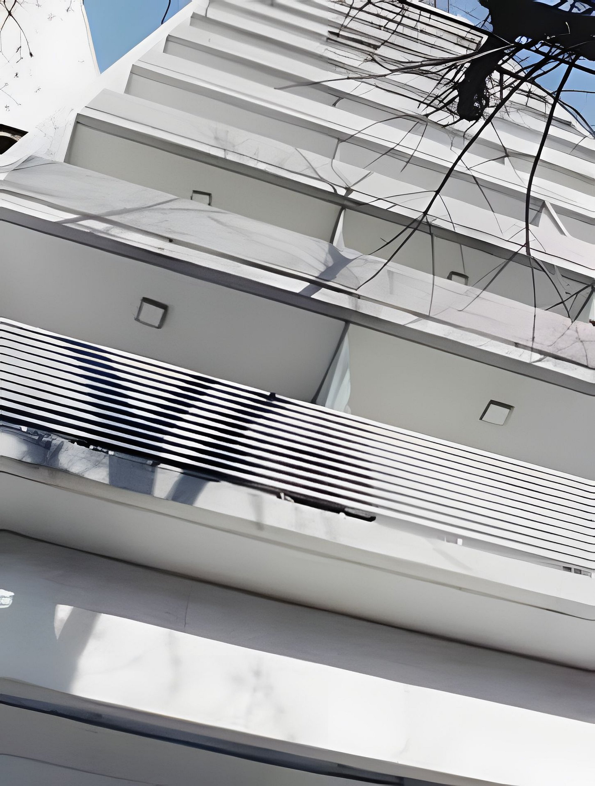 La fachada se organiza de manera simétrica, con amplios balcones corridos en cada planta, delimitados por barandas metálicas horizontales pintadas en blanco que aportan liviandad visual. El diseño prioriza la horizontalidad y la uniformidad, con ventanales de piso a techo que maximizan la luz natural y otorgan una imagen contemporánea y funcional.