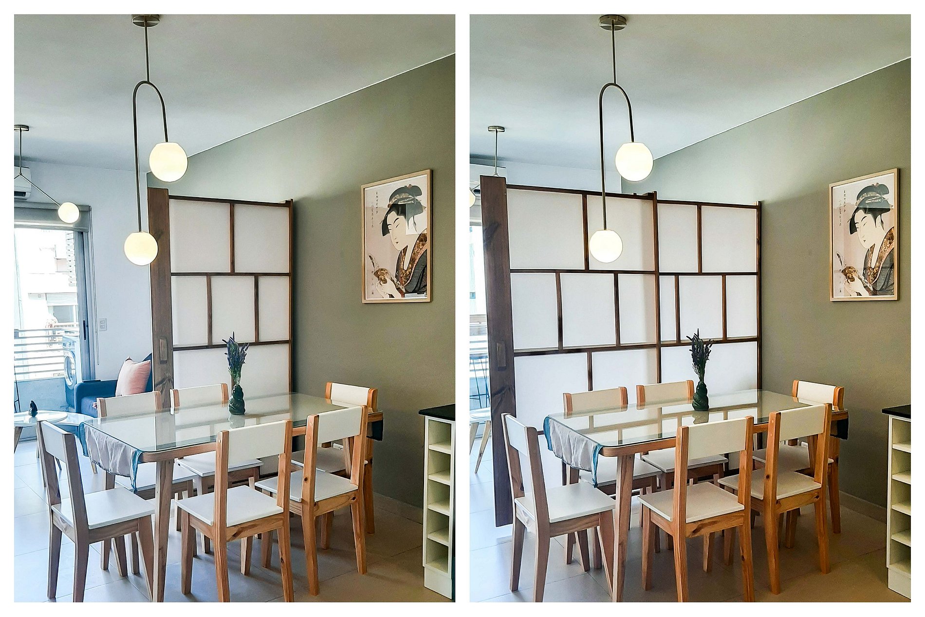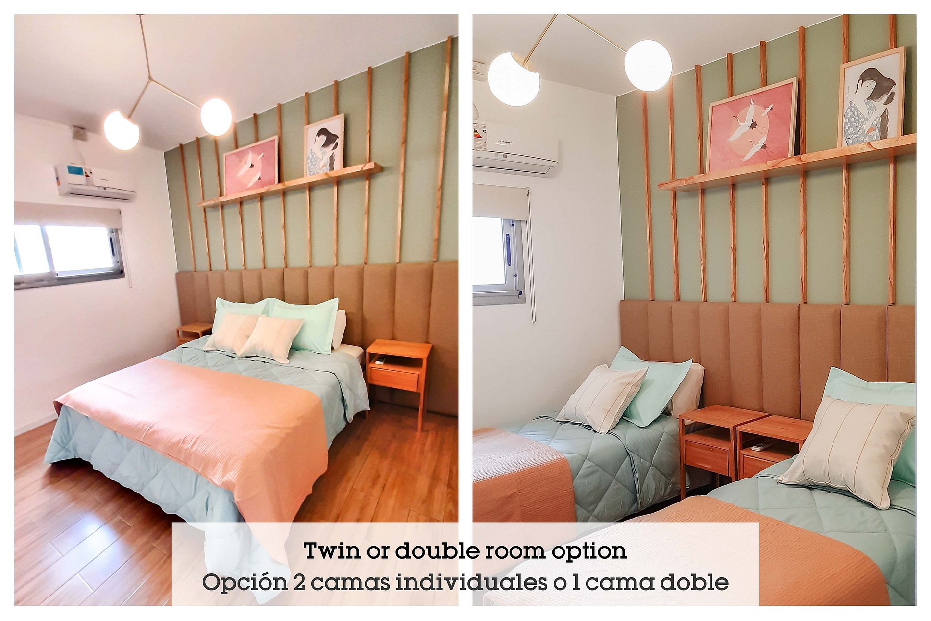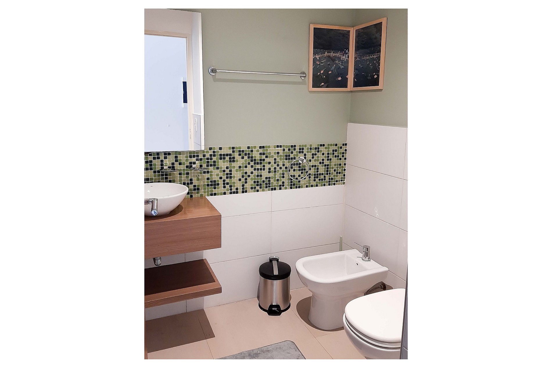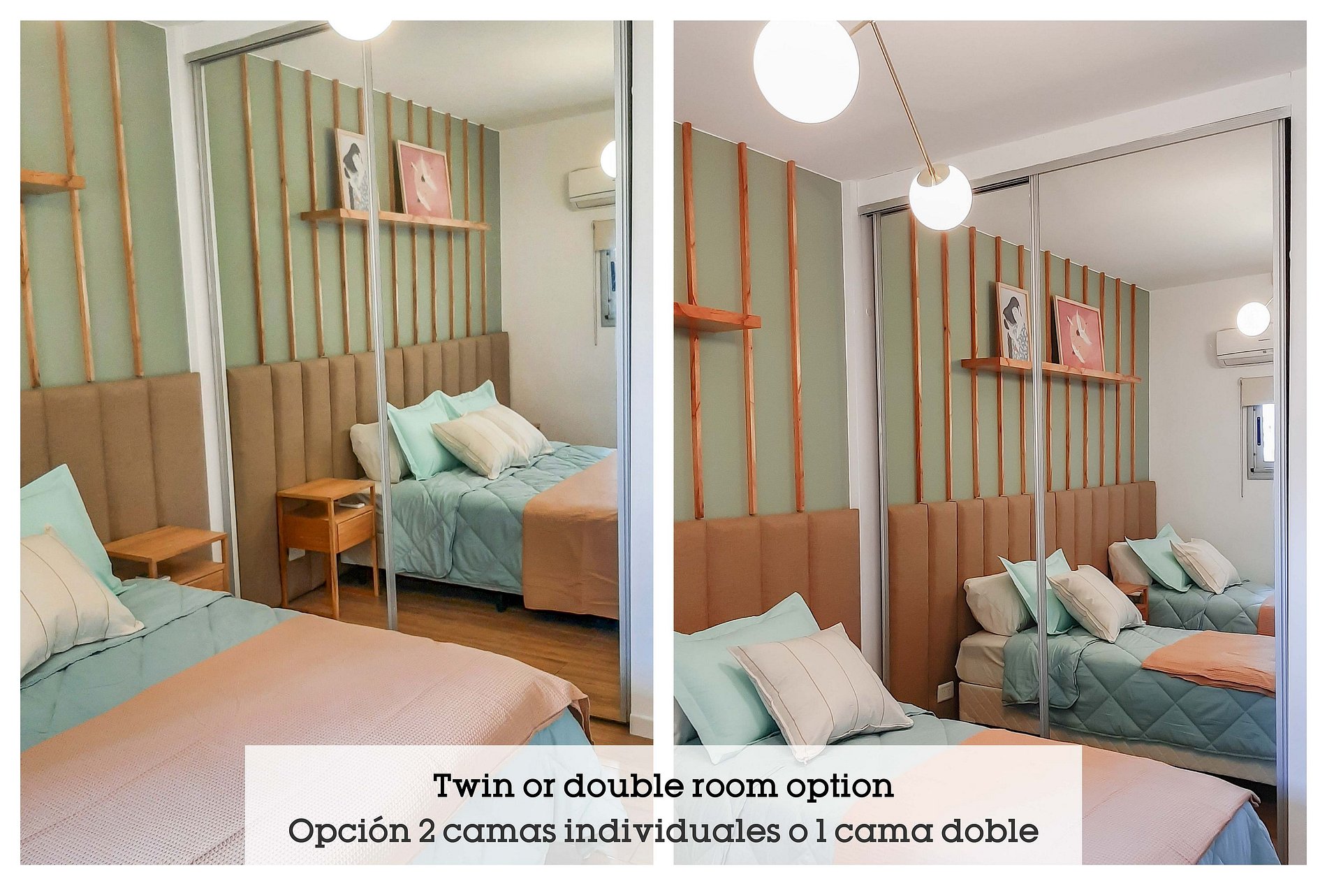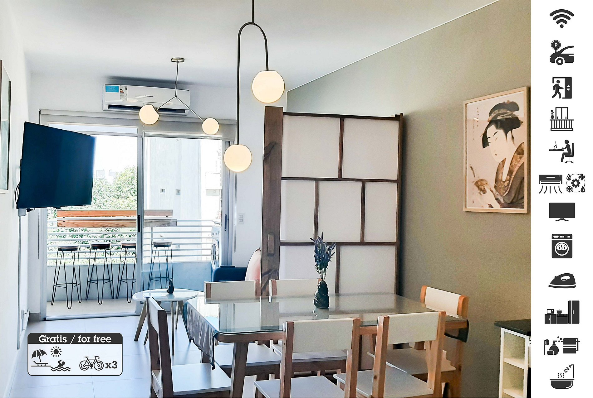 Descripción general Ubicado en el piso 11 de un edificio moderno con amenities, este hermoso departamento de 70 m² combina luminosidad, tranquilidad y un diseño inspirado en la estética japonesa contemporánea, donde la madera natural, los tonos verdes y los detalles artesanales transmiten serenidad y armonía. Ideal para disfrutar de Buenos Aires con estilo, confort y conexión con la naturaleza desde las alturas. ⸻ Living comedor El living comedor es amplio y luminoso, con ventanales que se abren al balcón y permiten la entrada de luz natural durante todo el día. Cuenta con un sofá de diseño en tonos azul noche, decorado con almohadones y mantas terracota, acompañado por mesas bajas orgánicas y una pared con mural floral que aporta calidez y carácter al espacio. El comedor, integrado al ambiente, dispone de una mesa de vidrio con estructura de madera maciza y seis sillas de líneas simples. Las luminarias esféricas suspendidas completan una atmósfera elegante y relajada. ⸻ Cocina La cocina se integra al living mediante una práctica barra desayunadora con banquetas altas, perfecta para compartir un café o un vino al atardecer. Está completamente equipada con horno y cocina eléctrica, microondas, pava eléctrica, tostadora, licuadora, vajilla completa y utensilios de cocina. Se ofrece café, té y condimentos básicos de cortesía. Todo el mobiliario mantiene una línea moderna y funcional, con detalles en madera clara y una cuidada iluminación. ⸻ Habitación principal La habitación principal es un espacio cálido y sofisticado, con una cama matrimonial de alta calidad, respaldar tapizado y una pared verde oliva con listones de madera verticales retroiluminados, que evocan el estilo japonés moderno. Dispone de un amplio placard espejado, TV de 32”, caja de seguridad, mesas de luz con lámparas y una salida directa al balcón. Desde este piso 11, las vistas abiertas a la ciudad y la vegetación aportan una sensación de calma y amplitud. ⸻ Segunda habitación La segunda habitación presenta un ambiente versátil y confortable, con un diván que se convierte en dos camas individuales, ideal tanto para familias como para amigos. El diseño mantiene la coherencia estética del resto del departamento, con pared verde, listones de madera natural y arte oriental minimalista. Cuenta con aire acondicionado, ropa de cama completa y espacio de guardado. ⸻ Baños El departamento cuenta con dos baños completos, uno principal y un toilette de apoyo, ambos con diseño moderno y detalles en tonos neutros. Incluyen ducha amplia, secador de cabello, toallas suaves, amenities de cortesía (shampoo, jabón y crema enjuague para la primera noche) y buena iluminación. ⸻ Balcón El balcón corrido rodea los ambientes principales y ofrece dos sectores diferenciados: • Un espacio de descanso con sillas de mimbre metálico y mesa baja frente a un jardín vertical, ideal para leer o tomar algo al aire libre. • Una barra exterior con banquetas altas junto al área de lavadero, equipada con lavarropas y espacio funcional oculto tras paneles de madera. La altura del piso 11 regala una vista abierta a la ciudad, con buena luz natural y total privacidad. ⸻ Cochera Se incluye una plaza de estacionamiento cubierta, apta para vehículos pequeños y medianos. Por el tamaño del espacio, no se recomienda para camionetas grandes. ⸻ Servicios y confort • Aire acondicionado frío/calor en todos los ambientes • WiFi de alta velocidad • TV por cable y streaming • Ropa blanca completa • Caja de seguridad • Lavarropas • Piscina y solárium en la terraza del edificio ⸻ Estilo y experiencia Cada rincón de este departamento ha sido pensado para ofrecer una experiencia relajante y estética, fusionando diseño japonés moderno con confort porteño. Los tonos verdes, las maderas naturales, la luz suave y los detalles florales crean una atmósfera que invita al descanso, la contemplación y el disfrute. Un refugio urbano en altura, donde el arte y la calma se encuentran con la funcionalidad y el confort.