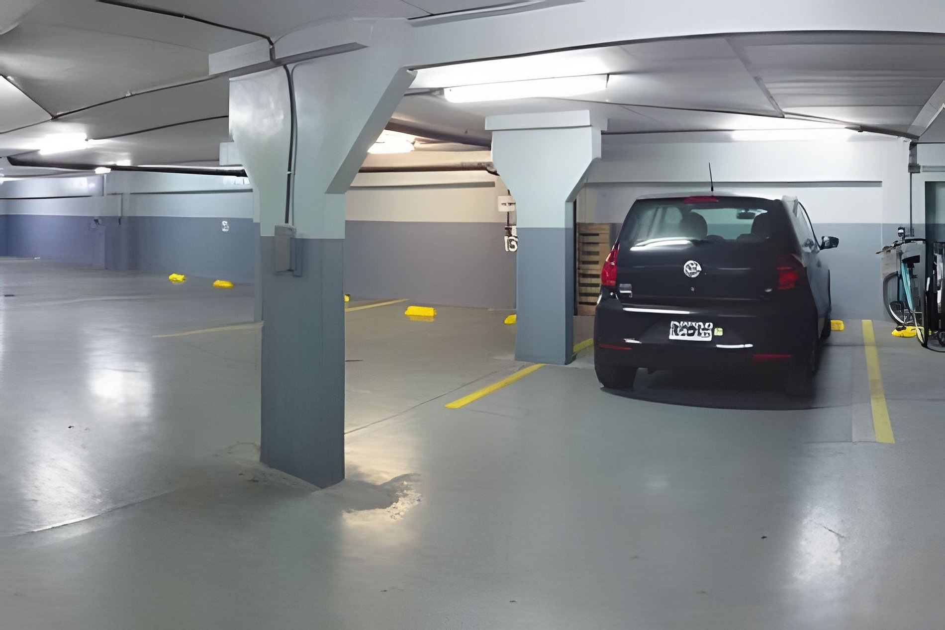 En su base, el edificio cuenta con cuatro niveles de cocheras cubiertas, con costo adicional, accesibles mediante elevador mecánico para vehículos no camionetas , y un hall de entrada moderno con frente vidriado a la calle. El zócalo comercial en planta baja suma dinamismo urbano al conjunto, integrando locales y acceso peatonal bajo un alero de hormigón.