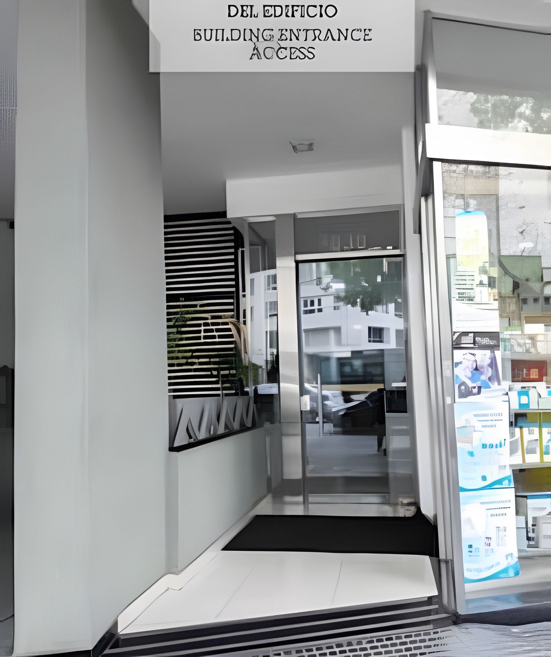 En su base, el edificio cuenta con cuatro niveles de cocheras cubiertas, accesibles mediante elevador mecánico para vehículos, y un hall de entrada moderno con frente vidriado a la calle. El zócalo comercial en planta baja suma dinamismo urbano al conjunto, integrando locales y acceso peatonal bajo un alero de hormigón.