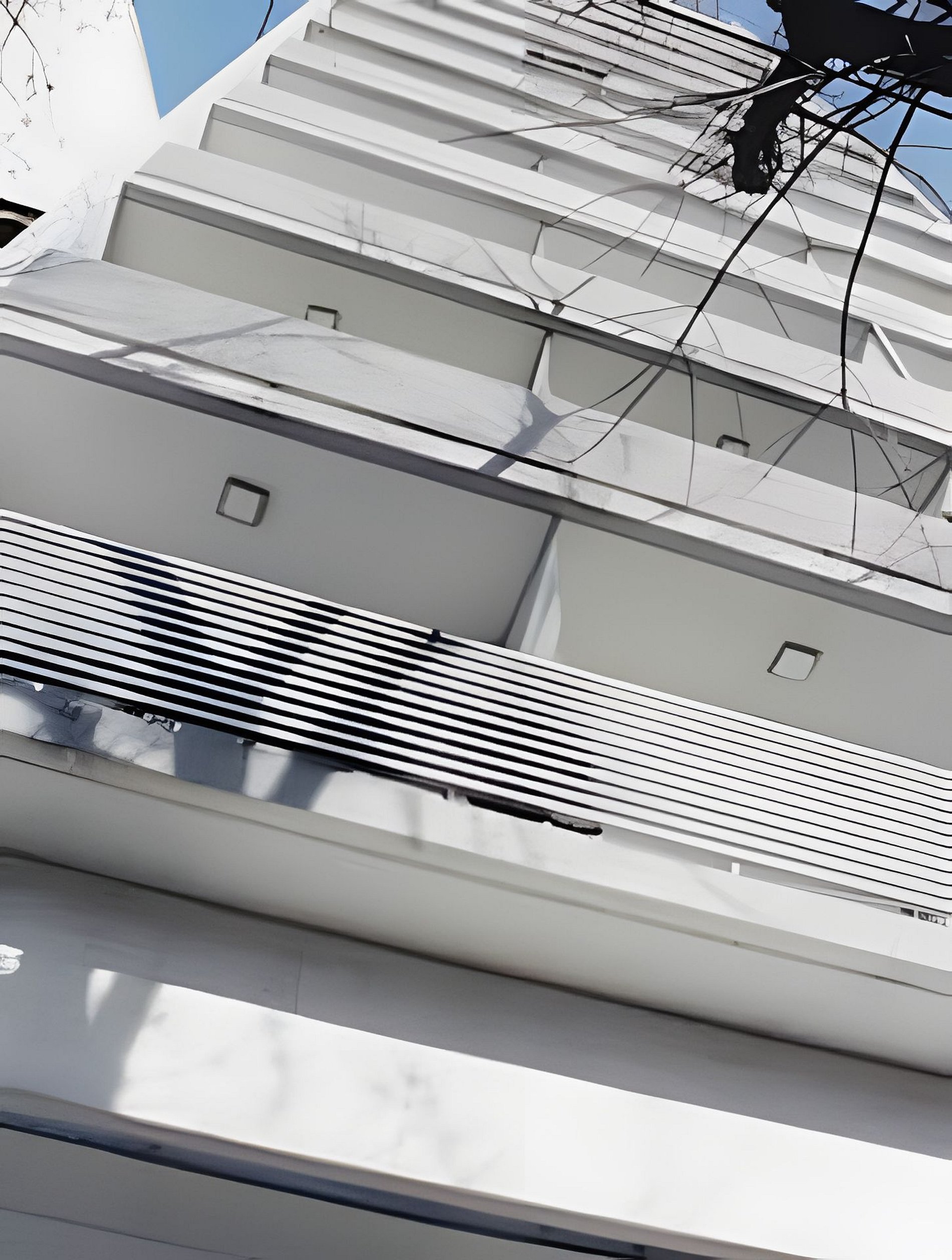 La fachada se organiza de manera simétrica, con amplios balcones corridos en cada planta, delimitados por barandas metálicas horizontales pintadas en blanco que aportan liviandad visual. El diseño prioriza la horizontalidad y la uniformidad, con ventanales de piso a techo que maximizan la luz natural y otorgan una imagen contemporánea y funcional.