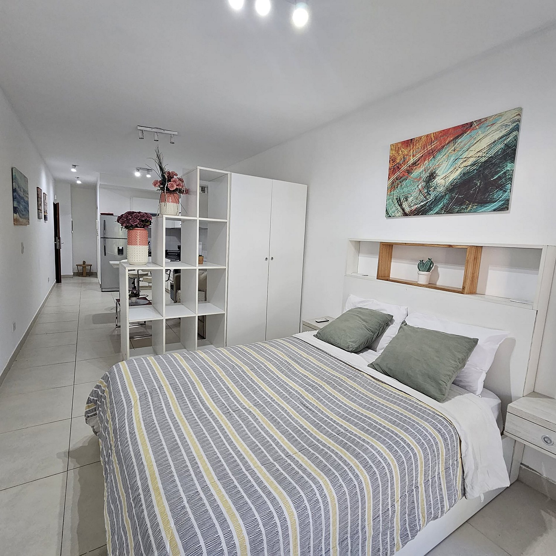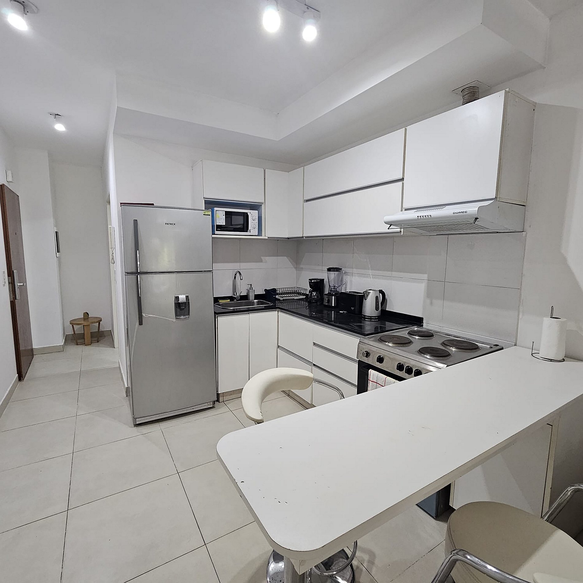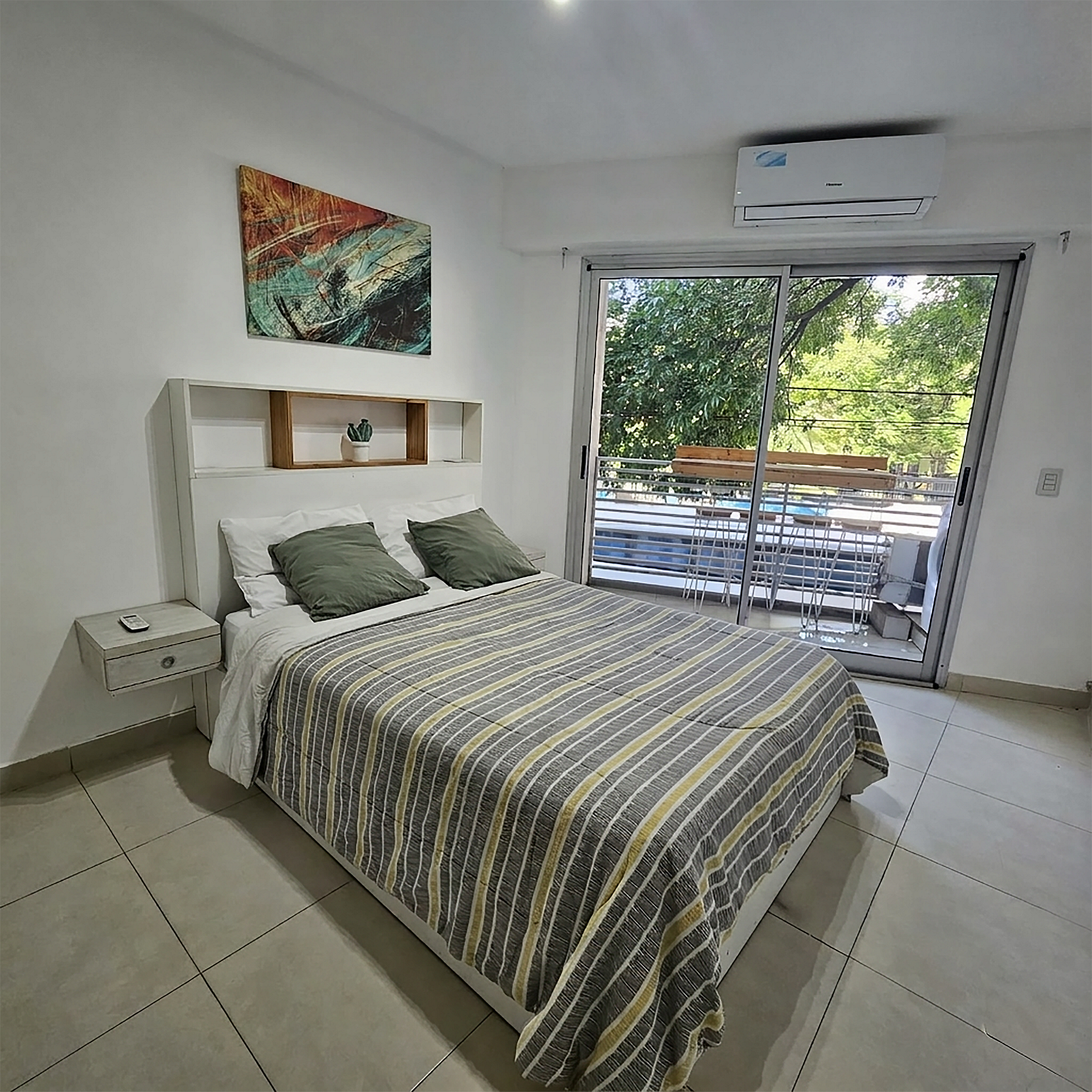 Este espacio destaca por su estilo moderno y funcional: un ambiente integrado con electrodomésticos, sofá cama y un balcón privado que aporta luz natural y aire fresco. Cada detalle está diseñado para ofrecer a los huéspedes una estadía práctica y cómoda.