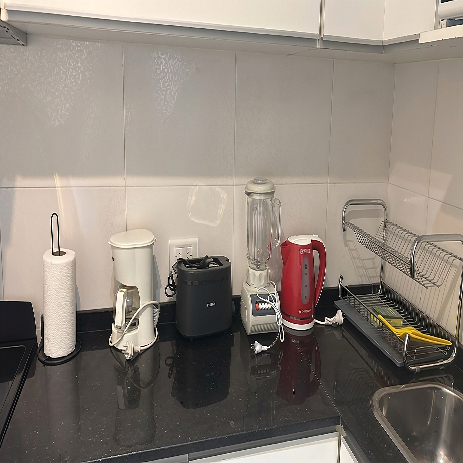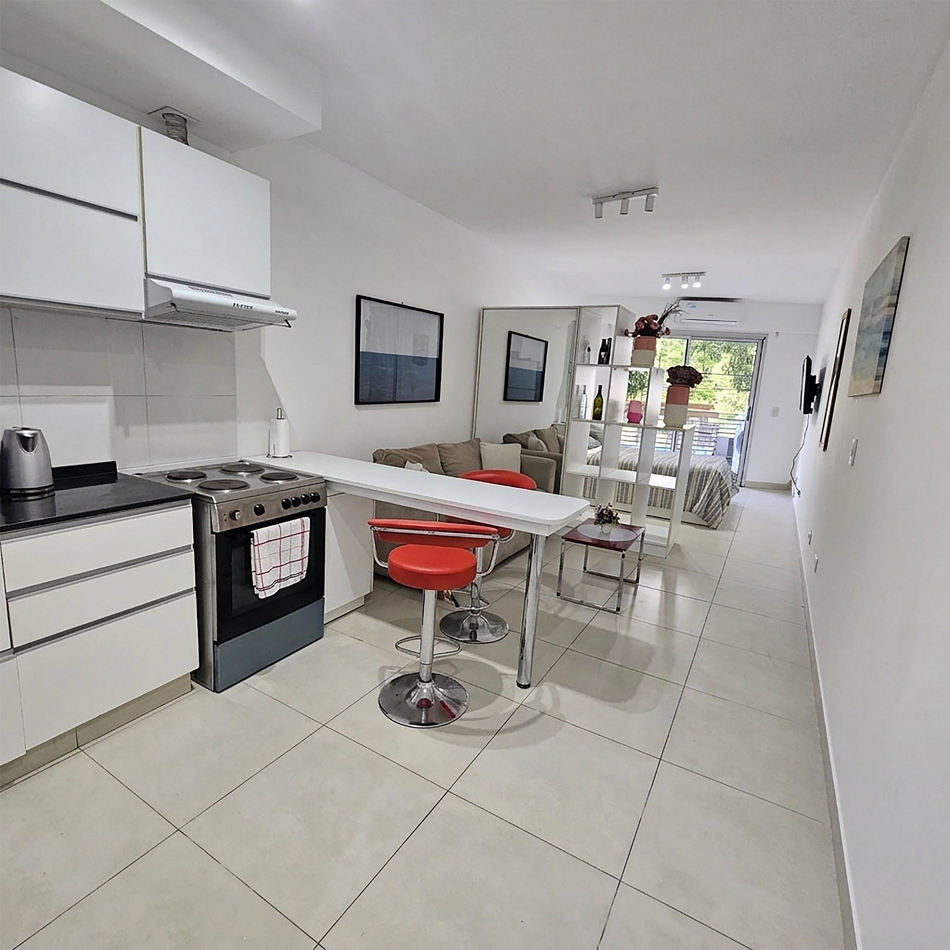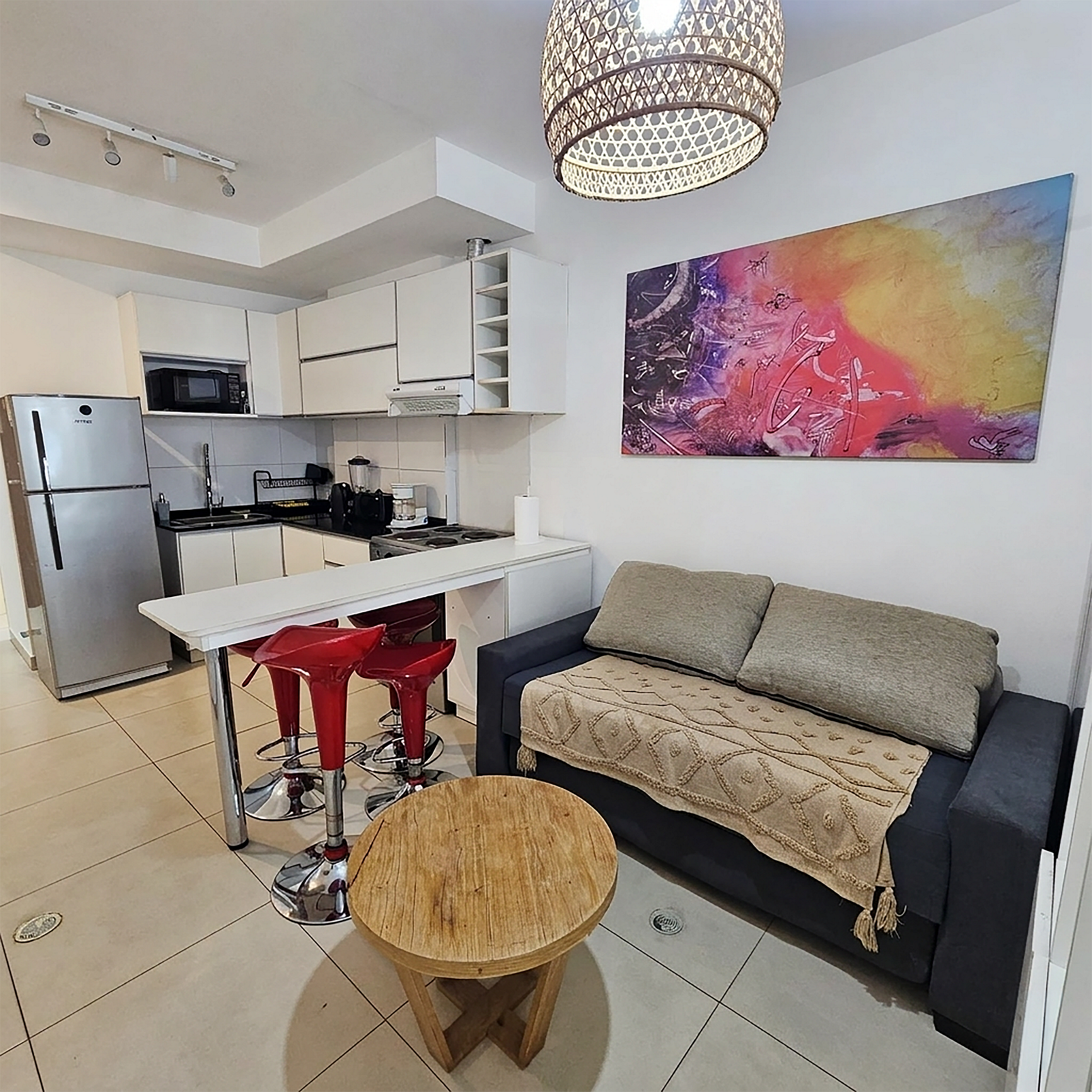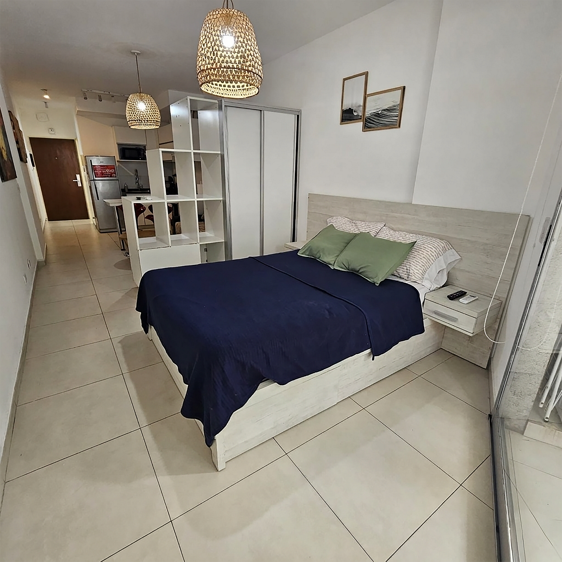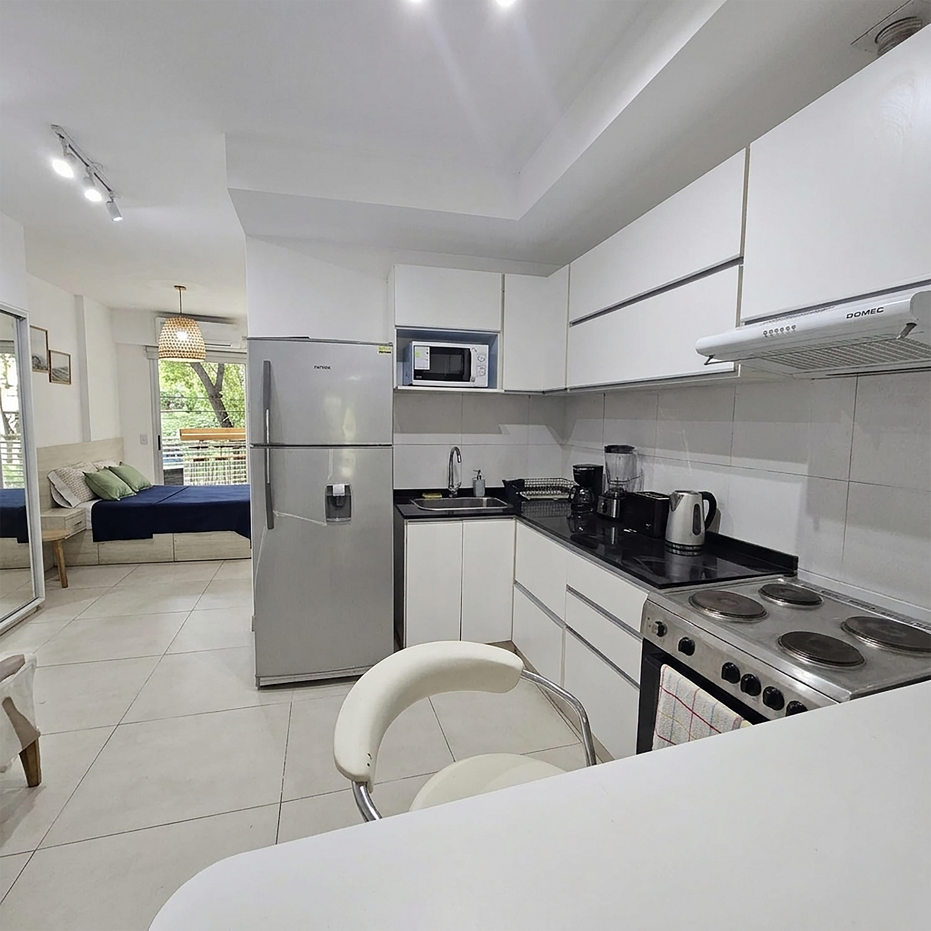 Este espacio se destaca por su diseño funcional y moderno: un ambiente integrado equipado con electrodomésticos, sofá cama y un balcón privado que aporta luz natural y aire fresco. Cada detalle fue pensado para que los huéspedes disfruten de una estadía cómoda y práctica.