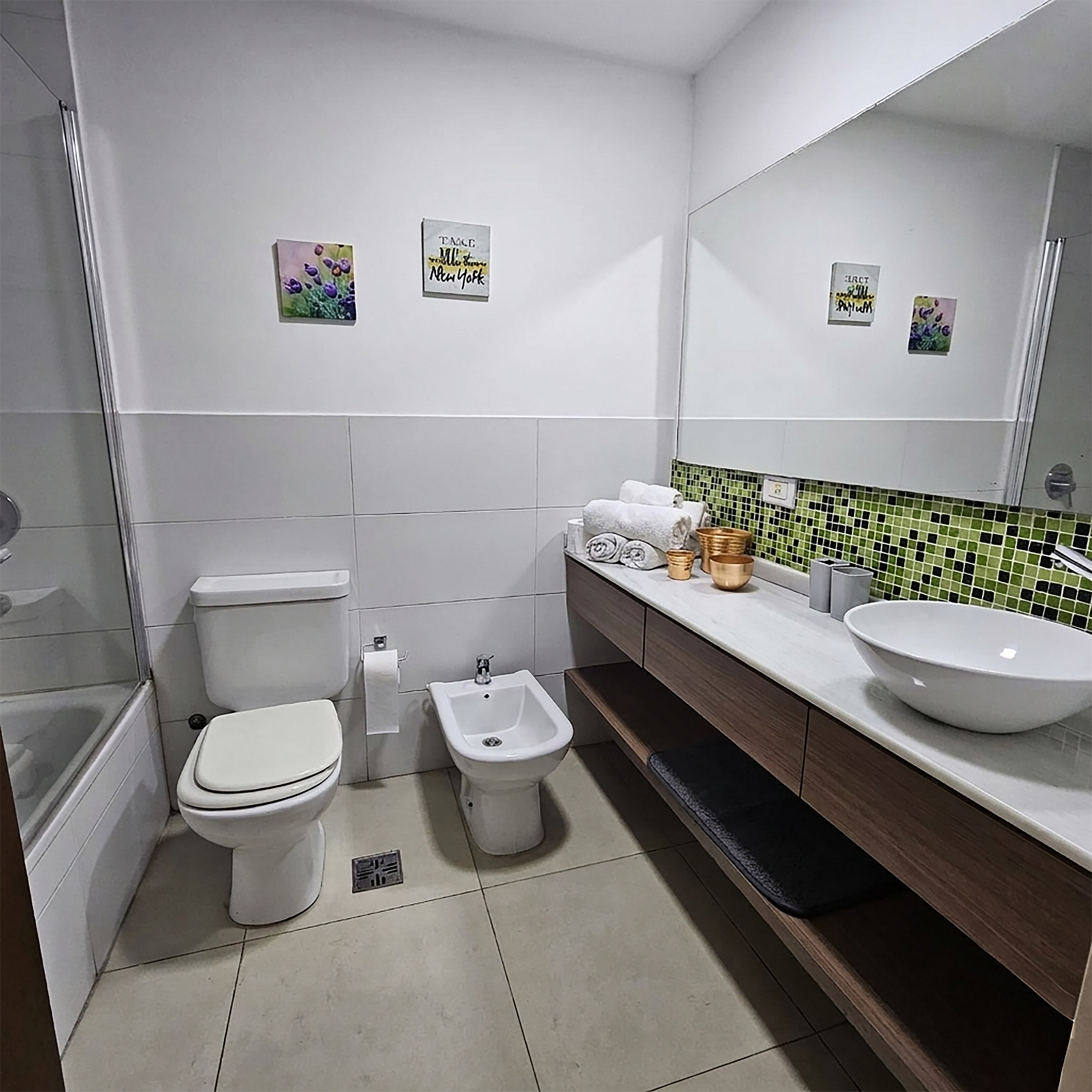 Servicio de traslado desde el aeropuerto Si necesitás traslado desde el aeropuerto hasta el departamento, podemos ayudarte con personal o taxis de confianza para ofrecerte un viaje seguro y rápido hasta la puerta del edificio. Una vez contratado el servicio, te compartiremos el contacto del conductor, a quien se le realiza el pago directamente. Reglas de la casa Máximo 4 huéspedes permitidos en la unidad en cualquier momento. No se admiten mascotas en ninguna parte del edificio. Está prohibido por el consorcio, incluso en áreas comunes. Por seguridad de todos los huéspedes y del personal, los recipientes de vidrio están estrictamente prohibidos en todas las áreas comunes, especialmente en la piscina. En caso de rotura, informar de inmediato al personal del edificio. Todos los huéspedes deben actuar con cortesía, evitando lenguaje ofensivo o cualquier comportamiento inseguro, ilegal, disruptivo u ofensivo en las áreas comunes. Es obligatorio el uso de vestimenta adecuada (calzado, remera/camisa, etc.) en todo momento en las áreas comunes. En la zona de piscina también debe usarse vestimenta adecuada. Reglas de la piscina Se requiere atuendo de baño adecuado. Antes de ingresar a la piscina, todos deben usar las duchas de enjuague. No está permitido saltar, correr ni realizar juegos bruscos. No se deben dejar objetos (zapatos, juguetes, etc.) en la piscina o en su borde, ya que pueden causar accidentes. No se permite subir a los ascensores mojados ni sin vestimenta adecuada. Niños menores de 12 años deben estar siempre acompañados por un adulto o tutor mayor de 18 años. Los niños que no estén entrenados para ir al baño deben usar pañales de natación. Está prohibido arrojar pelotas u objetos similares en la piscina. No se permiten flotadores grandes (sillas inflables, colchonetas, etc.). Solo están autorizados dispositivos de flotación de apoyo para niños pequeños. Respetar la capacidad máxima de la piscina según lo publicado en el lugar. No se permite el ingreso ni consumo de bebidas alcohólicas ni alimentos personales en la piscina. No están permitidos radios ni dispositivos de música externos. Está prohibido el uso de lenguaje abusivo o grosero. Horario de la piscina Mayo a septiembre: de 10:00 a 19:00 hs Septiembre a mayo: de 10:00 a 21:00 hs